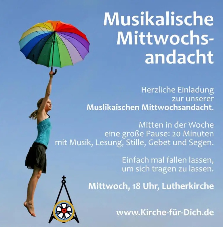 18 Uhr Andacht in der LutherkircheMitten in der der Woche eine große Pause:20 Minuten Musik, Lesung, Stille, Gebet und SegenEinfach mal fallenlassen, um sich tragen zu lassen!